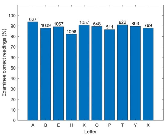 All displayed letters by the TV-app presented a similar difficulty to the examinees, as demonstrated in Figure 11, which shows the percentages of correct read out of each letter.