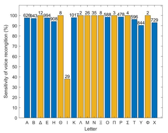 Percentage of letters correctly identified by the voice recognition service (sensitivity). The number of each letter’s appearance is shown at the top of each column. Blue bars: Latin letters used in the test and appearing in TV-app; orange bars: letters not included in the test, thus not appearing in TV-app.