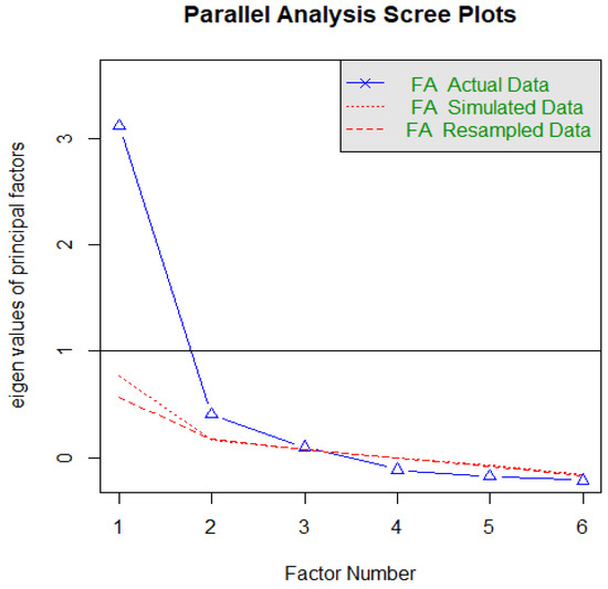 Table 3 presents the results of the EFA. As mentioned above, EFA was used on half of the dataset (n = 167). The dataset was considered suitable for EFA since Bartlett’s test of sphericity was found to be significant (p < 0.001), and the KMO was found to be satisfactory (0.84) [30]. The principal components analysis with varimax rotation (Kaiser’s normalization) was used as the extraction method. In addition, parallel analysis techniques were used to determine the number of factors (Figure 1). In line with the theoretical background and previous empirical findings, the best result was the two-factor solution. This finding is in line with the original scale [4]. Factors can be named as information fatigue (IF) (item 1–3, alpha = 0.84) and behavioural fatigue (BF) (item 4–6, alpha = 0.80). The factor loadings for the six-item solution were higher than 0.5 since they ranged between 0.68 and 0.90 and were considered satisfactory [30]. The factor solution explains 75.32% of the total variance (IF explains 59.76% of the variance, and BF explains 15.56%). The overall internal consistency for the total PF scale showed good internal reliability (six items, alpha = 0.86).