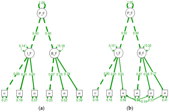 Results of the confirmatory factor analysis: (a) Model 2 (6-items model (2 factors) (b) Model 3 (6-item model (2 factors, correlated errors).