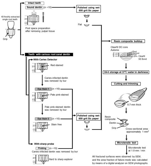 Accordingly, many studies on fiber posts bonding to root canal dentin have been reported [5,6,7,8,9,10]. In early studies, they reported that composite resins exhibited good bonding to root canal dentin [9,10]. However, in recent studies, the effects of aging on bond strength have been studied. Botter et al. investigated the effect of thermomechanical loading on the bond strength of fiber posts luted with three different resin cements. They suggested a decrease in bond strength after thermocycling. The other reports also suggested that the bond strengths of fiber posts decreased after aging by thermocycling. However, these studies used intact human teeth [5,6,7,8,9,10], while clinical situations often involve root canal dentin of varying qualities and conditions. We need further investigations of root canal dentin bonding in various root conditions, such as caries-affected dentin. For coronal dentin, several reports have been conducted on resin bonding for caries-affected dentin [11,12,13,14,15,16,17]. To obtain caries-affected dentin, artificial caries made in intact extracted human teeth were used in some studies, and caries lesions of extracted human teeth were used in other studies. For caries removal techniques, a laser treatment and a chemomechanical removal technique have been added to the conventional method using burs. The laser treatment decreases the bonding strength of caries-affected dentin to composite resin. Carisolv, as a chemomechanical treatment, did not affect the bonding strength.