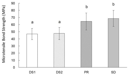 The results of the microtensile bond strength test are shown in Figure 2. The bonding values of PR and SD were significantly higher than those of DS1 and DS2 (p < 0.05) (DS1: 46.9 ± 7.9; DS2: 47.5 ± 8.4; PR: 64.6 ± 11.9; SD: 68.7 ± 11.1 MPa). The bond strength values of DS1 and DS2 were similar, and those of PR and SD were similar.