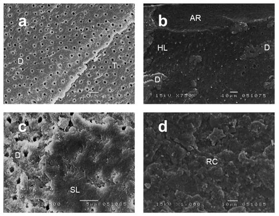 Representative scanning electron microscopy (SEM) images of the fracture interfaces used in the classification of the failure patterns (a–d) (a,d: 1000×, b: 750×, c: 3500× magnification), adapted from Otake 2010. (a) Failure in the dentin (D) at the fractured surface. Exposed dentinal tubules can be seen. (b) SEM image showing three types of failure patterns: cohesive failure in adhesive resin (AR), cohesive failure in dentin (D), and failure in the hybrid layer (HL). (c) Fractured surface of DS1 showing fracture in the smear layer (SL). (d) Failure in the resin composite (RC) at the fractured surface.