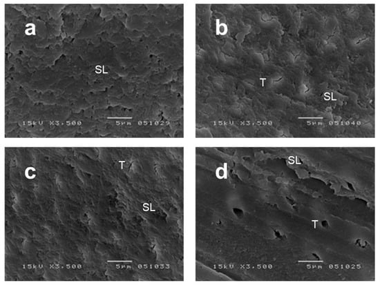 Representative scanning electron microscopy images (3500× magnification) of the dentin surface before priming procedures (a–d), based on Otake 2010. (a) DS1 specimen shows a scraped surface with a rich smear layer (SL). (b) DS2 specimen shows a scraped surface with a rich smear layer (SL) and tubule orifice occlusion (T). (c) PR specimen showing a thinner smear layer (SL) and tubule orifice occlusion (T). (d) SD specimen showing exposed dentinal tubules (T) and a thin smear layer (SL).