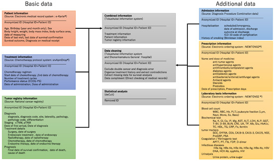 Patient demographic data, including age, birth year and month, sex, postal code, and insurance type, were documented at the time of the issuance of medical record identification. In addition, body height, body weight, body mass index, body surface area, and date of measurement were recorded based on practical requirements. Moreover, the date of the last visit, the last date of survival confirmation, the date of death, and the diagnosis on medical receipt were automatically recorded as part of routine clinical practice. The above information can be extracted from a unified medical record system (e-Karte and Newtons2, Software Service, Inc., Osaka, Japan).