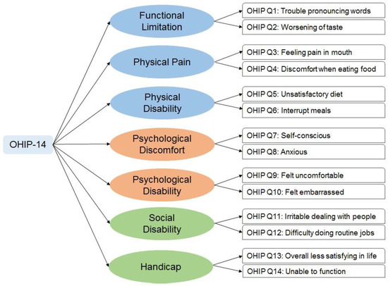 The second section contained questions related to the OHRQoL based on the oral health impact profile (OHIP)-14 questionnaire. The questions were framed to determine the impact of the severity of malocclusion on seven domains, each containing two items related to routine activities of the participants [33]. The domains were functional limitation, physical pain, physical disability, psychological discomfort, psychological disability, social disability and handicap (Figure 1) [21].