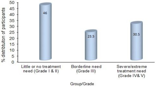 In this study, there were 112 participants with little or no treatment need (grades I and II of the IOTN-DHC), 57 with borderline need (grade III of the IOTN-DHC) and 74 with great or severe orthodontic treatment need (grades IV and V of the IOTN-DHC). The corresponding percentages were 46%, 23.5% and 30.5%, respectively (Figure 2).