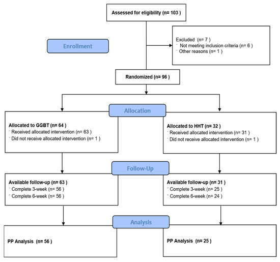 A total of 96 patients were randomly assigned to the GGBT (n = 64) and HHT (n = 32) groups in a 2:1 ratio. Among them, 81 subjects (n = 56 in GGBT, n = 25 in HHT) who completed all 6 weeks of the study period were included in the economic analysis. The CONSORT flowchart of the study process is shown in Figure 1. The baseline characteristics of the study participants are presented in Table 1. There were no statistical differences between the groups for any variable at baseline (Table 1). A total of 14 (25%) adverse events were reported in the GGBT group and 12 (48%) in the HHT group. Mild adverse events such as nausea, vomiting, or diarrhea were observed, but neither definitely related nor serious adverse events were observed.