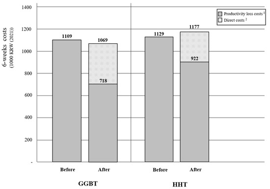 The productivity loss cost during the six weeks before enrollment in the clinical trial was almost similar between the GGBT and HHT participants (Figure 1). After enrollment, the productivity loss cost was reduced by 35.2% and 18.3% in the GGBT and HHT groups, respectively. The total costs related to insomnia after receiving GGBT (KRW 1,069,000) were lower than the costs for six weeks before the intervention (KRW 1,109,000), while the total costs in the HHT group increased after treatment from KRW 1,129,000 to KRW 1,177,000 (Figure 2). The main reason for cost savings in the GGBT group was the reduction in lost productivity costs.