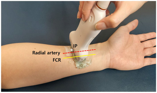 The RA pulse of healthy participants was palpated and marked at the junction between the middle and distal third of the forearm. The preliminary needle insertion point (IP) was determined and marked as the point 5 mm lateral to the pulse using a tape measure, based on a previous study in which the superficial radial nerve was located 1.02 ± 0.29 cm lateral to the RA at this forearm level [9].