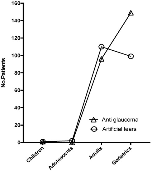 The age groups included in the active surveillance study for antiglaucoma were children (n = 1; 0.41%), adults (n = 96; 39.02%), and elders (n = 149; 60.57%). Meanwhile, for the artificial tears study, they were children (n = 1; 0.47%), adolescents (n = 2; 0.94%), adults (n = 110; 51.89%), and elders (n = 99; 46.70%). As expected, antiglaucoma was mostly prescribed to elderly patients, whereas artificial tears, mainly in the adult group, were exposed. The information collected from active surveillance and spontaneous reporting showed that, for the antiglaucoma study, the age group presenting ADRs most frequently was the elders. In contrast, the age group with the most frequent ADR presentation for the artificial tears group were adults, congruent with the age groups where each of the medications were mostly prescribed (Figure 1).