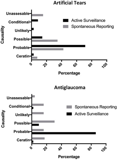 The most frequent causality for active surveillance (both treatments) was “probable”; however, for this parameter, a marked difference was observed in the reports of active surveillance when compared to spontaneous reporting in both drug groups: antiglaucoma (86.17% vs. 16.00%) and artificial tears (71.43% vs. 42.30%) (Figure 2).