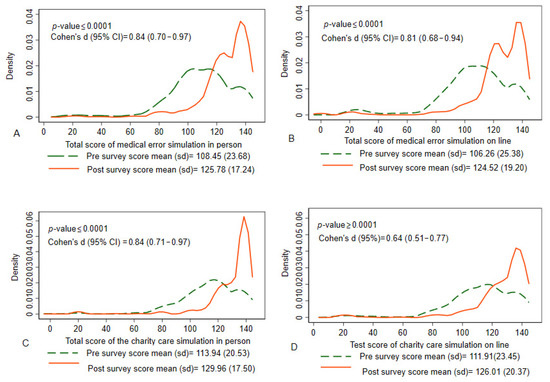 The density plots of the pre-survey and post-survey scores with mean (sd) and by the type of simulation, the Medical Error simulation in person and online (See (A,B)) and the Charity Care simulation in person and online (See (C,D)). Note: The figures show similar magnitude of effect for the medical error simulation in person and online, however when compared to the charity care simulation in person, the magnitude of effect decreases for the charity care simulation online.
