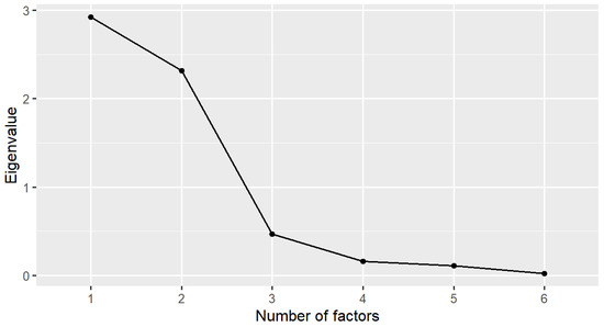 - Before conducting the EFA, we used the Kaiser–Mayer–Olkin (KMO) test to assess the sampling adequacy. A KMO index ≥0.50 is an acceptable value [34], and Bartlett’s test of sphericity with a significant statistical test (p < 0.05) [35] is desirable. The EFA with principal component analysis extraction and Varimax rotation methods was applied to test the dimensions of the CSPS-6. Items with a factor loading of >0.40 were set. Two methods we used to define the number of factors retained were the Kaiser criterion of eigenvalues (eigenvalue >1 rule) [36,37] and a scree plot. Factors to be retained were determined by the eigenvalues above and to the left of the straight line through the smallest eigenvalues on the scree plot [38,39].