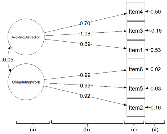Because the KMO value was 0.65 and Bartlett’s test of sphericity was significant (χ2 = 1287.3, p < 0.001, degrees of freedom = 15), it was appropriate to use the EFA. Results of the EFA in Table 2 and Figure 1 suggest that the CSPS-6 had two factors, labeled “completing work” and “avoiding distraction” in the original English version, with eigenvalues >1 that explained 87.4% of the total variance of the responses.