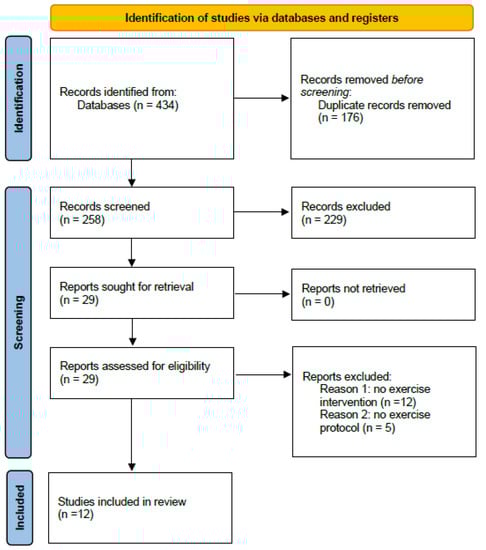 The search strategy identified 434 articles from the databases. After removal of duplicates, 258 articles were initially screened via title and abstract, and 29 were iden-tified as potentially relevant. Full-text examination further excluded 17 studies, leaving 12 studies for inclusion in this analysis, all RCTs (Figure 1).