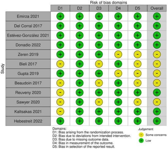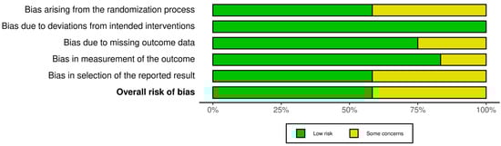 The risk of bias analysis revealed that seven studies (58%) [,,,,,,] presented low risk, and five studies (42%) [,,,,] were classified as presenting some concerns. The most common biases were: (i) “bias arising from the randomization process” where five studies (42%) [,,,,] were classified as “some concerns”, mainly because the process was not sufficiently described; (ii) and “bias in selection of the reported result”, where five studies (42%) [,,,,] were classified as “some concerns” (Figure 2 and Figure 3).
