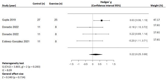 The results of our meta-analysis (see Figure 4) on this variable in children showed no significant changes, perhaps due to an insufficient number of studies or to lower sample sizes, although a moderate effect size is noteworthy (SMD = 0.22; 95%CI: −0.25 to 0.68; p = 0.73).