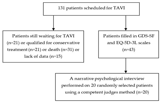 The prevalence of major depressive disorders in the general population in Europe is estimated to be 6.6–6.9% [,]. It reaches 9.1% in older people (≥65) in the EU [] and 15–30% in patients with coronary artery disease []. In a group of older adults undergoing transcatheter aortic valve implementation (TAVI) or surgical aortic valve replacement (SAVR), one in three has depressive symptoms [,]. These data are in line with the results of the PolSenior study, in which clinically significant depressive symptoms were found in 29.7% of the elderly population aged 65 and over in Poland []. The European Society of Cardiology and the American Heart Association list depression as a modifiable risk factor for coronary artery disease and for major adverse cardiovascular events after the onset of acute coronary syndromes, among other risk factors, such as hypertension, smoking, and hyperlipidemia [,,,,,]. Recent studies have shown that persistent depression is associated with a 3-fold increase in mortality at 6 months, while baseline depression is associated with mortality at 1 month and at 12 months among the elderly undergoing TAVI treatment []. Furthermore, cognitive impairment and depressive symptoms are two risk factors associated with an increased risk of mortality in a progressive, additive manner in elderly adults [,,]. Previous research has shown that TAVI improved the health-related quality of life (HRQoL) in multiple dimensions, such as, mobility, self-care, and pain perception, among others [,,,,,], and reduced depression and anxiety levels in patients with aortic stenosis [,]. The population which benefits from TAVI is increasing. Consequently, elderly patients with aortic stenosis and many comorbidities, who previously were inoperable, are successfully admitted for this procedure []. Nevertheless, little is known about the role of depression in older adults undergoing transcatheter aortic valve implementation, especially with respect to results based on quality measures and interview methods such as narration and thematic analysis. Several previous studies have emphasized that the diagnosis should be confirmed through a comprehensive expert evaluation in addition to the recommendation of the American Heart Association to screen for depression using a brief questionnaire [,,,].