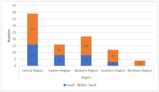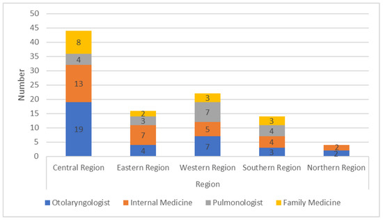 One hundred sleep physicians (43% Saudis, 75% males) from all five regions of Saudi Arabia participated in this study. Most respondents were from the central region (44%), while only 4% were from the northern region (Table 1) (Figure 1). The respondents included physicians specialized in otolaryngology (n = 35), internal medicine (n = 31), pulmonology (n = 18), and family medicine (n = 16) and were distributed among the five regions (Figure 2). Most of the participants were specialists (n = 37), followed by consultants (n = 35) and residents (n = 28). Although all participating physicians treat OSA in their practice, only 9% had a fellowship in sleep medicine. The majority (64%) had come across the topic of treatment of sleep apnea using oral appliances (Table 1).