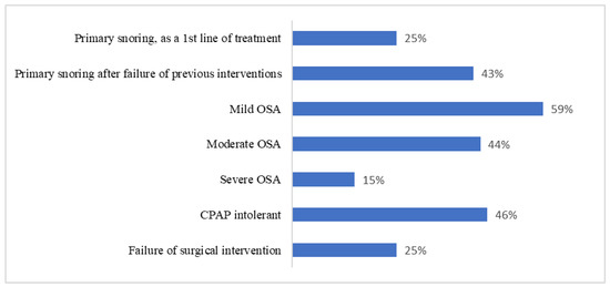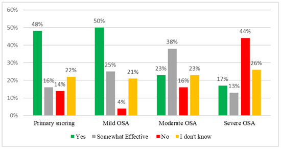 Regarding the effectiveness of OAs, nearly half (48–50%) of physicians believed that OAs could be effective in treating primary snoring or mild OSA cases. However, 23% and 17% thought OAs were effective in moderate or severe OSA (Figure 3).