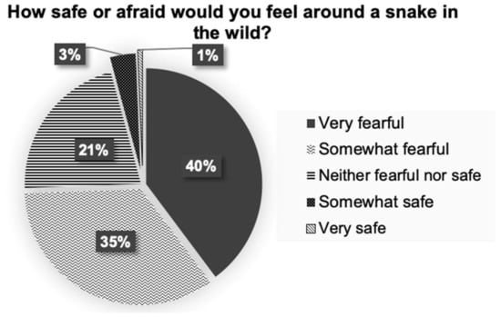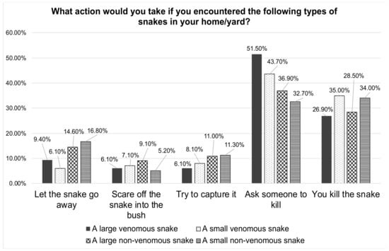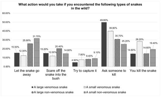 The third sub-section included a single question on a 5-point Likert scale, which required the respondents to state the extent of their fear of snakes in the wild. The fourth and fifth sub-sections pertained to the perception of health science students’ perceptions towards encountering different types of snakes. We asked the respondents to indicate what action they would take if they encountered snakes in the wild and in their home or yard, respectively. The snakes were categorized as large venomous, small venomous, large non-venomous, and small non-venomous.