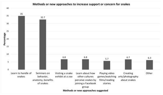 The last sub-section included a single open-ended question eliciting different methods or approaches the respondents believed would increase their support or respect for snakes. Based on the open-ended responses received, we grouped them under 7 categories.