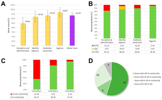 The entire NMT team of our unit (n = 9) was audited over 1 month. The detailed results obtained are summarized in Figure 1. Of the 36 injections evaluated, 33 (91.67%) were conventional intravenous injections for scintigraphy and only 3 (8.33%) were subcutaneous injections for lymphoscintigraphy. The average total score, on all themes evaluated, for the 36 injections observed was 93.36% ± 3.52% (min-max: 85.87–97.20%) (Figure 1A). The average proportion of unmet and partially met items during one injection was 7.01% (min-max: 0–20.51%) and 3.00% (min–max: 0–8.82%), respectively. The themes for which the proportions of unmet items were the most important were Reception and administration (17.22%) and Radiation protection (10.19%) (Figure 1B). The proportion of conformity of the studied items seemed to be related to their criticality, with 97.24% of the criteria of high criticality in conformity, 90.61% of the criteria of intermediate criticality in conformity, and 83.13% of the criteria of low criticality in conformity (for 1.39%, 4.47% and 15.94% of non-conformity, respectively) (Figure 1C). Out of the 4 themes evaluated, 12 criteria (23.53%) had a non-conformity rate above 50%, including the introduction of the NMT (83.3% non-conformity, n = 29/36), the use of a lead apron (55.6%, n = 20/36), the questioning of patients of childbearing age about potential breastfeeding (83.3%, n = 5/6) or the proper 4-step detersion when placing a catheter (100%, n = 5). Conversely, 28 of the criteria assessed (54.90%) had a compliance rate of 100%, 6 criteria (11.76%) had a compliance rate between 50% and 99%, and 13 criteria (25.49%) had a compliance rate between 0% and 49% (Figure 1D).