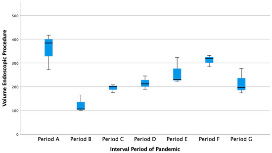 An overview of the overall average volume of endoscopy services compared to the period before (period A) and during the pandemic (accumulative average from period B–G) is shown in Figure 2 and Table 2. The average volume of endoscopy services before (January–March 2020) and during the pandemic was 358 ± 76.1 and 219 ± 67.5 per month. Based on the T-test, the decrease in endoscopy volume was statistically significant, with a p-value = 0.004.