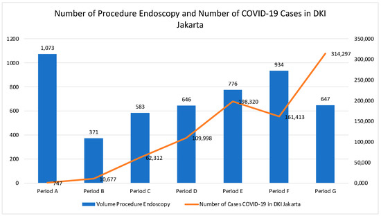 This study combines the criteria for Urgent and Emergency cases. Figure 3 explains the trend in the volume of endoscopy services along with the number of COVID-19 cases in Jakarta per pandemic period.