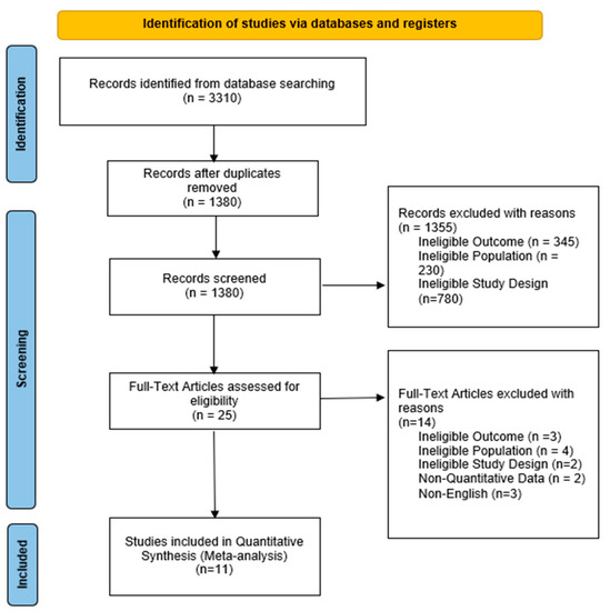 The PRISMA diagram (Figure 1) reports the study selection process conducted in this study. The number of unique articles identified were 1380, from which, 25 full text articles were accessed for eligibility. 11 articles of 11 different studies were included and analyzed in this study. The reasons for the exclusion of the 14 articles were stated in the flow-diagram.