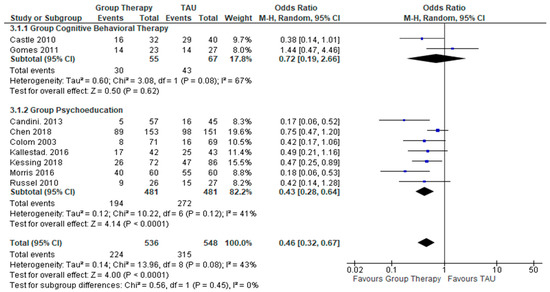In the 9 RCTs (Figure 2) reporting on the treatment outcomes involving the relapse rates, the pooled effect for GCBT does not show any favorable response in terms of reduction in overall relapse rates for the participants under the GCBT group over the control condition, (OR = 0.72, 95% CI = 0.19 to 2,66, Z = 0.50, p = 0.62) (I² = 67%, p = 0.08). However, the pooled effect for GPE showed a significant favorable response in terms of reduction in relapse rates of GPE as opposed to the control condition (OR = 0.43, 95% CI = 0.28 to 0.62, Z = − 4.14, p < 0.0001) (I² = 41%, p= 0.12). This finding suggested that GPE demonstrated a significant impact in reducing the relapse rates of people with bipolar disorder.
