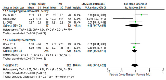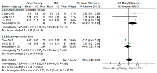 Group Cognitive Behavioral Therapy (GCBT) seeks to apply the principles of cognitive behavioral therapy on a larger group of individuals. These include cognitive restructuring, use of exposure exercises and problem solving [9]. With group sizes ranging from 8 to 14 and the number of sessions from 10 to 20, GCBT helps individuals identify problems, recognize thoughts, and differentiate facts from irrational thoughts. Through those methods, GCBT challenges the dysfunctional assumptions present and allows individuals to learn and cope with these thoughts in their everyday lives. On the other hand, Group Psychoeducation (GPE) is a general term that refers to any intervention that educates the patients and their family members about the disease condition with the aim to improve overall outcomes. These can range from education on medication to enhance adherence to education on lifestyle management and coping strategies [12]. The group sizes usually vary from 5 to 15 in a group and the number of sessions varies depending on the objective of the programs in the respective institutions, and they generally stay within their allocated groups. As the therapist can see multiple patients at one session, the advantages of group therapy include cost-effectiveness and shorter waiting time. The disadvantages of group therapy include lack of privacy and negative group dynamics (e.g., splitting among group members) [13]. Beynon et al. (2008) and Bond K. et al. (2015) performed systematic review on effectiveness of GPE in treating bipolar disorder but lacked statistical analysis [8,12]. Currently, the National Institute for Health and Care Excellence (NICE) Guidelines recommends adjunctive psychotherapies as an adjunct to psychotropic medications with the adjunctive psychotherapies being cognitive behavioral therapy and psychoeducation, either as an individual or in a group [14]. However, the guidelines also emphasized that the results have a low quality of evidence and are not statistically significant in terms of outcome measures. As a result, the effectiveness of group therapy, including GPE or GCBT, as an adjunct treatment for bipolar disorder remains debatable and inconclusive [12,15].