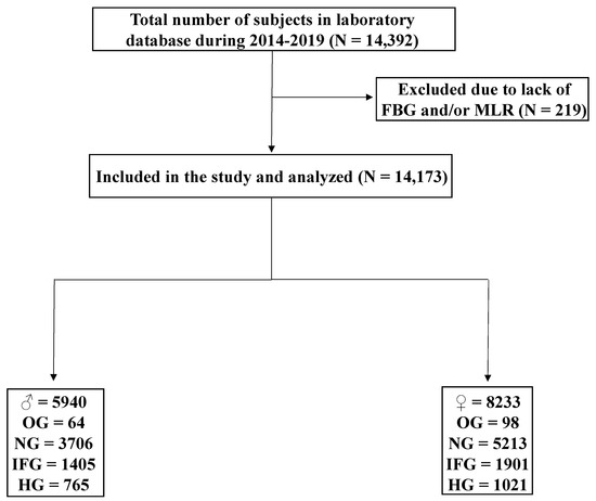 This is a retrospective, cross-sectional study of MLR fluctuations as a function of FBG and HbA1c in a total of 14,173 subjects (Figure 1). The study protocol was approved by the Biomedical Ethics Unit of Al-Borg Medical Laboratories; the legal owner of the data, under approval #07/21. Age, sex, and laboratory results were collected from 11 August 2014 to 18 July 2020, and no informed consent was required given the retrospective nature of the study and the lack of access to personal identifiable information. Subjects were stratified based on the ADA guidelines [27,28] for FBG into OG (FBG < 70 mg/dL), normoglycemia (NG; 70–99 mg/dL), IFG (100–125 mg/dL), and HG (≥126 mg/dL) groups. Subjects were considered normal if HbA1c was <5.7%, pre-diabetic if 5.7–6.4%, and diabetic if ≥6.5% [28]. To validate HbA1c results, anemia was excluded as defined by a hemoglobin level of <12 g/dL [29]. MLR of >0.191 was considered high based on the best cutoff (i.e., highest sensitivity and specificity) as revealed by receiver operating characteristics (ROC) curve analysis.