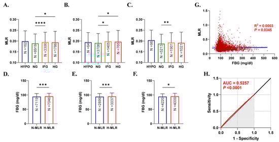 Figure 2D shows that the median FBG in subjects with normal MLR (N-MLR) significantly increased (p < 0.001) from 94.0 (87.0–105) to 95.0 (87.0–106) in the high MLR (H-MLR) group. Both male and female subjects exhibited the same pattern of increase (94.0, 87.0–105 vs. 95.0, 88.0–107, p < 0.001) and (94.0, 87.0–104 vs. 95.0, 87.0–106, p < 0.05) as seen in Figure 2E,F, respectively.