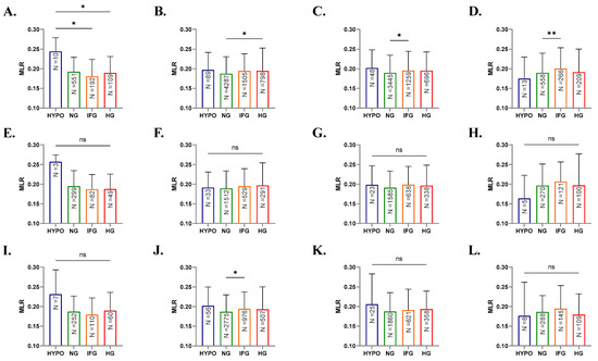 Further stratification of subjects by age revealed distinct and shared patterns in MLR fluctuations. In Figure 3A, young subjects of both genders showed significantly reduced MLR in IFG (0.181, 0.147–0.224, p < 0.05) and HG (0.189, 0.149–0.231, p < 0.05) groups compared to the OG group (0.244, 0.210–0.230). Compared to the NG group, significant increases in MLR were seen in young adults of the HG group (0.188, 0.153–0.231 vs. 0.195, 0.155–0.253, p < 0.05), and adults (0.189, 0.155–0.235 vs. 0.195, 0.159–0.244, p < 0.05) and elderlies of the IFG group (0.189, 0.155–0.239 vs. 0.20, 0.168–0.253, p < 0.05) as depicted in Figure 3B–D. When either males or females were analyzed alone, no significant differences in MLR were found among the different glycemic states except in female young adults (Figure 3J) who exhibited significant elevation in MLR from 0.186 (0.151–0.230) in the NG group to 0.194 (0.157–0.237) in the IFG group (p < 0.05).