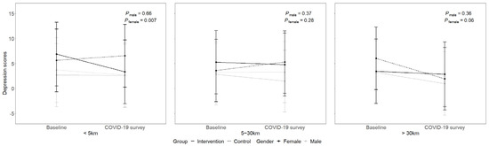 3.2. Longitudinal Changes of the Gender-Specific Differences in Outcomes between Intervention Groups by Distance to the High-Risk Areas