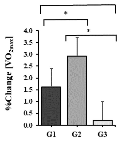 Relative before–after changes in VO2max concentration after 30 days of training at 2000 m altitude (G1), living at 1850 m and training at 2200 m (G2), namely 300 m (G3). Values displayed represent mean ± sd. Significant differences (p < 0.05) between training courses are marked with *.