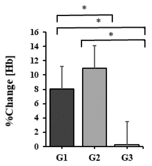 Relative before-after changes in Hb concentration after 30 days of training at 2000 m altitude (G1), living at 1850 m and training at 2200 m (G2), namely 300 m (G3). Values displayed represent mean ± sd. Significant differences (p < 0.05) between training courses are marked with *.