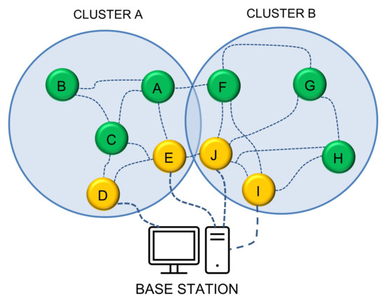 Figure 1 presents the design artifacts of the region-based energy-efficient multipath routing approach (REMR) that provides low-energy, trustable, and efficient routing in WBAN for healthcare monitoring. In REMR, the WBASN nodes are divided into clusters and preferably multiple nodes are selected as CRs in each cluster which helps in routing packets through various clusters by the selection of a path with the least energy requirement. Algorithm 1 shows how the clusters are formed based on energy level and least distance from BS. Nodes D and E are the candidate gateway for cluster A, while the I and J nodes represent cluster B. If F needs to send data to the base station, it has an alternate path using J, E, and I nodes. The source node F has paths from its region, while it has another alternative of sending data using cluster A’s candidate node E.