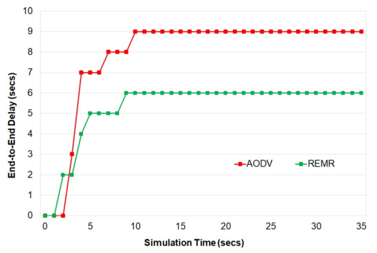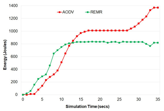 Figure 2 shows that the REMR performs better in comparison to AODV in terms of energy consumption. One thing that should be mentioned here is that at a certain point in the simulation, the energy consumed by REMR became almost constant. In comparison to that, the AODV protocol continued to consume a large amount of energy.