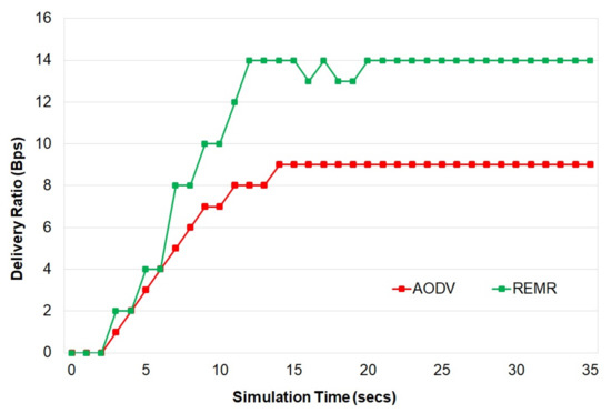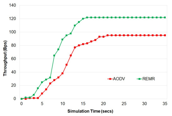 Figure 3 shows the results of throughput of REMR (edited AODV in the simulation environment) and AODV as implemented in the reference [20]. It is observed that REMR performs better than AODV in terms of throughput due to recursive and energy-efficient implementation in the proposed REMR. This is also because REMR uses multipath routing, whereas AODV uses single-path routing.