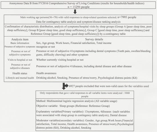 The subjects (anonymized individual data) were 7995 persons (3883 men and 4112 women) aged from 30 to 69 years in FY2016. The sample file was drawn so that the distribution was not biased by sex or age strata, and all data were in categorical data format. The subjects were extracted for analysis from the household survey (survey of sex, age, household structure, household economic consciousness, etc.) and the health survey (survey of symptoms, hospital visits, lifestyle habits, health awareness, etc.) in accordance with the stepwise procedure shown in Figure 1. This was a cross-sectional study.