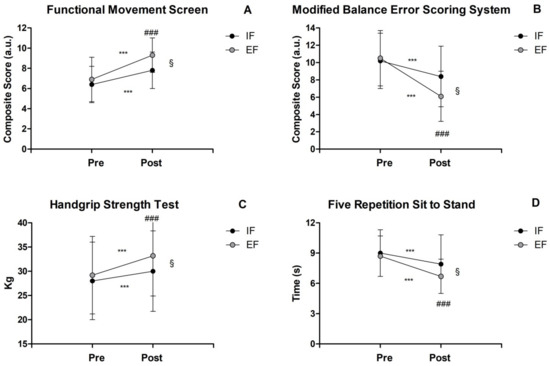 Fitness parameters: (A) FMS Composite Score, (B) M-BESS Composite Score, (C) HST, (D) FRSTS. § Significant interaction (p < 0.001). *** Significant main effect of time before and after testing (p < 0.001). ### Significant main effect of group (EF vs. IF) (p < 0.001).