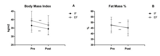 Finally, both the fat mass percentage and body mass index did not reveal any significant interaction (Figure 2A,B) except for a main effect of time (FM%, F1,26 = 5233.0, p ≤ 0.001, part η2 = 1.00; BMI, F1,26 = 194.1, p ≤ 0.001, part η2 = 1.00). In detail, the EF and IF groups showed a similar decrease by 5% in FM% (EF from 47.7 ± 4.2 % to 45.1 ± 7.1 %; IF from 47.5 ± 5.3 % to 45.4 ± 5.4 %), as well as a reduction in BMI (EF 6%, from 37.7 ± 3.9 kg/m2 to 35.4 ± 4.2 kg/m2; IF 5%, from 36.5 ± 4.0 kg/m2 to 34.6 ± 3.7 kg/m2).