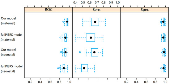 Based on the predictor variables selected in the fullPIERS model and the best performing machine learning algorithms selected by the two models developed in this study, the benchmark models using fullPIERS predictor variables and trained using the same dataset, however, were outperformed by our models (Table 4 and Figure 1). By comparison with the models developed in this study, although the benchmark models had similar AUCs of 0.942 (95% CI [0.930, 0.960]) vs. 0.965 (95% CI [0.953, 0.973]) for adverse maternal outcomes and 0.889 (95% CI [0.869, 0.911]) vs. 0.923 (95% CI [0.906, 0.937]) for neonatal outcomes, they had lower sensitivity (the ability to distinguish patients at risk): 0.623 (95% CI [0.554, 0.676]) for the benchmark maternal model vs. 0.686 (95% CI [0.629, 0.735]) for our maternal model; 0.323 (95% CI [0.267, 0.390]) for the benchmark neonatal model vs. 0.533 (95% CI [0.467, 0.600]) for our neonatal model.