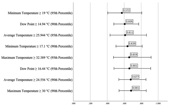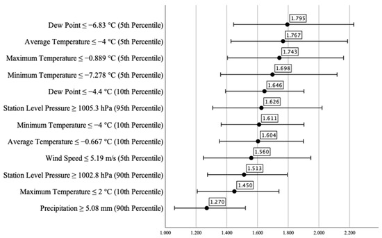 Our study showed that extremes of low temperature and dew point and high atmospheric pressure were risk factors for an increased number of daily emergency visits. The range of odds ratios was between 2.690 and 4.929 in the case of cold-temperature-related emergency visits. This, therefore, indicated that in extreme cold weather conditions, the risk of a higher-than-average number of daily emergency visits can increase almost fivefold. Our results are in line with other studies investigating the association between cold temperature events and the frequency of emergency visits [21,22,23]. Similar conclusions were drawn in a systematic review, which reported that the fraction of respiratory morbidity attributable to cold was 12.2% in high-income countries and 25.7% in a middle-income country [24].