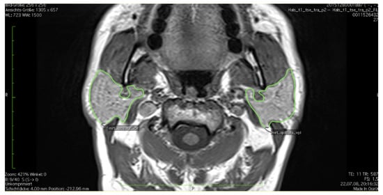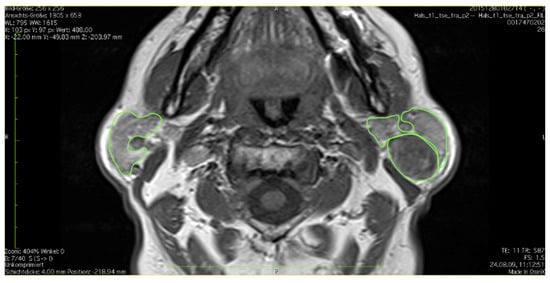 In axial T1-weighted images the tissue of the parotid gland was outlined and marked manually as region of interest (ROI) in each layer via the open source software OsiriX Dicom Viewer. Images had a slice thickness of 4 mm. Left and right gland were measured separately. Extra glandular tissue such as lymph nodes, blood vessels and extracapsular fat were excluded in each layer (Figure 1).