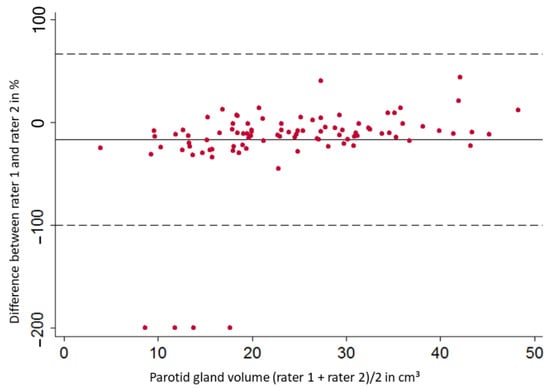 After pre-test measurements of the volume of both parotid glands in 100 subjects performed by two different readers, we observed an interrater reliability for the right parotid gland with a mean bias of 7.94% and a consecutive 1.96-fold SD of 54.68% (left parotid gland: 16.73% with a 1.96-fold SD of 83.39%). The resulting Bland–Altman plot is illustrated as Figure 3. The measured values scatter evenly around the mean value, except for four outliers. Finally, an ICC of 0.72 for the right and 0.78 for the left parotid gland was calculated and considered ‘moderate’ and ‘good’ [26].