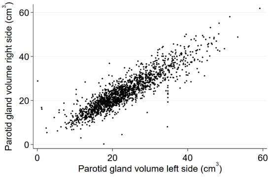 Minimum and maximum values of parotid parenchyma volume were evaluated separately for each side, and the mean, median and standard deviation (SD) were calculated. Pearson’s correlation coefficient r was calculated to compare the right and left glandular parenchyma volumes. Sex-specific differences between parotid volumes were compared using a Mann–Whitney U test.